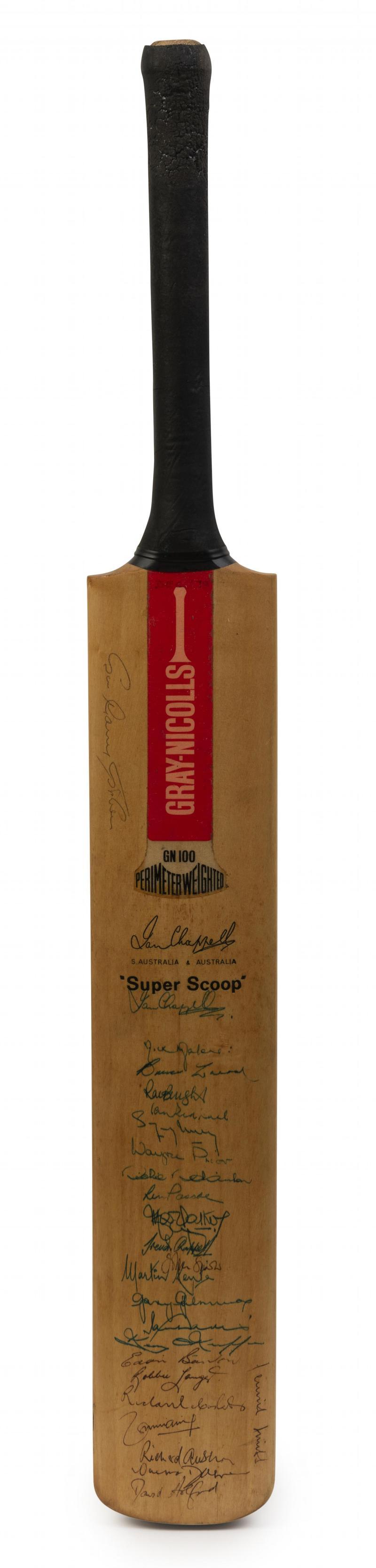 1970s 'Gray-Nicolls - Ian Chappell' cricket bat endorsed at top 'Dec.78' with 25 signatures including Ian Chappell, Mick Malone, Bruce Laird, Ray Bright, Ian Redpath, Dennis Amiss & Sir Gary Sobers. Bat in Fine condition with signatures clear. (Image1)