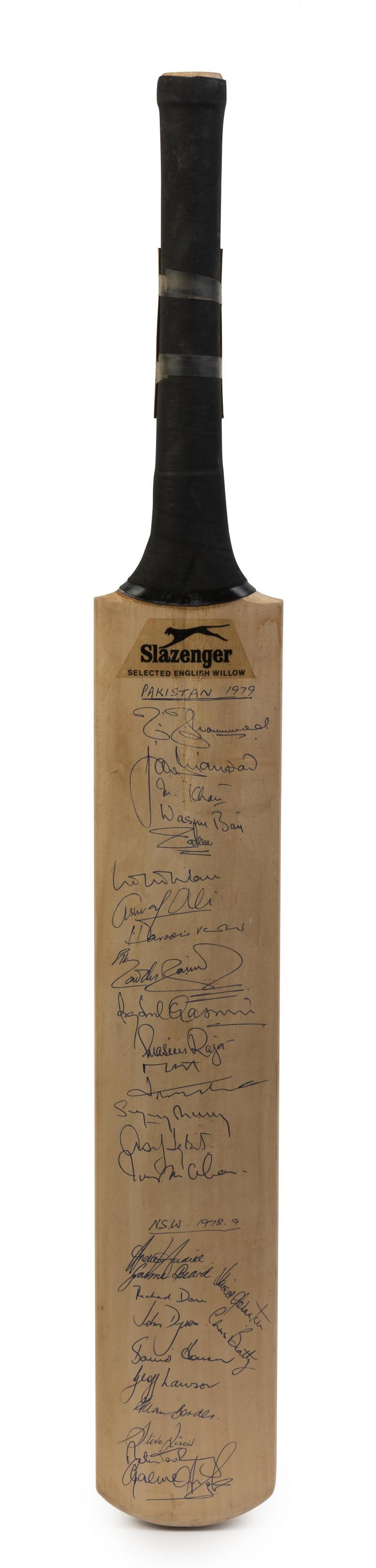 1978-79 'Slazenger' cricket bat, signed on front & reverse by 1978-79 Australia & England, 1979 Pakistan, 1978-79 NSW teams plus 10 Australian legends (probably due to the WSC "War"), with 66 signatures including Neil Harvey, Lindsay Hassett, Alan Davidson, Mike Brearley, Graham Yallop, Mushtaq Mohammad & Andrew Hilditch, Fine condition. Ex Alan Davidson collection. (Image1)
