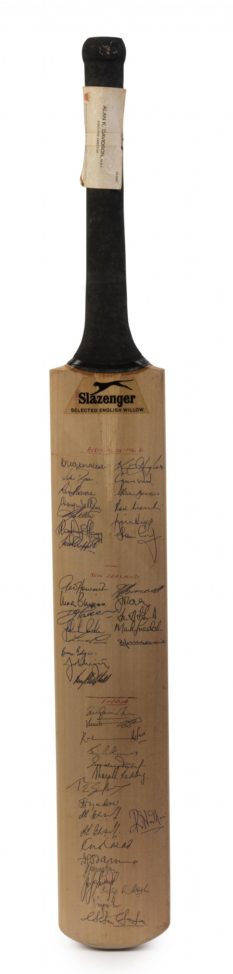 1979-81 'Slazenger' cricket bat, signed on front & reverse by 1979-80 Australia, England & West Indies, 1980-81 Australia, New Zealand & India teams, with 90 signatures including Mike Brearley, Greg Chappell, Clive Lloyd, Doug Walters, Richard Hadlee & Sunil Gavaskar, Fair condition (minor spots). Ex Alan Davidson collection. (Image1)
