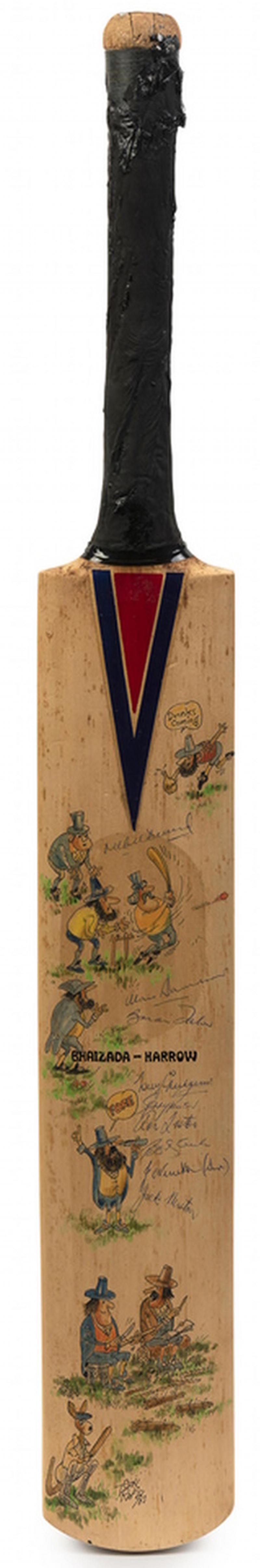 Tony Rafty Cartoons 'Steeden' cricket bat, endorsed 'Bhaizada - Harrow' with colourful hand-drawn cartoons, and 9 signatures including Richie Benaud, Alan Davidson, Brian Taber & golfer Jack Newton, Fair condition (some spots & handle rubber perishing). Ex Alan Davidson collection. (Image1)