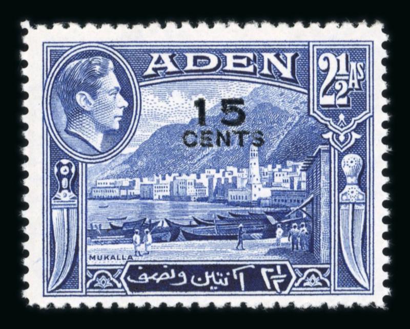 1951 KGVI 15c on 2 1/2a deep ultramarine, with surcharge doubled, unmounted mint (SG £1600); with certificates RPS 1981, 2024 when this stamp was in a block of four (of which this is the top left stamp), extremely rare and fine. (Image)