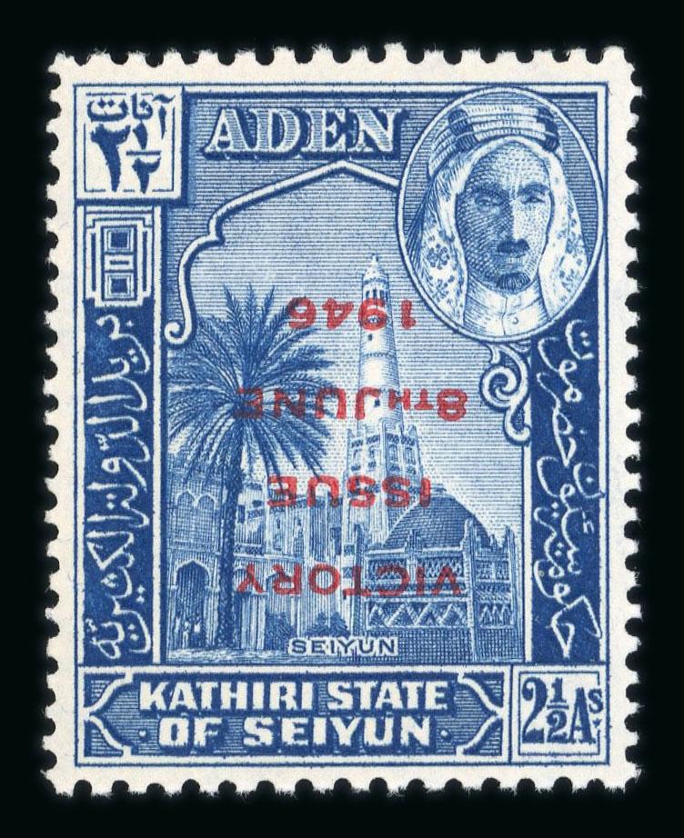 1946, 2 1/2a blue overprinted in red VICTORY ISSUE 8th JUNE 1946, with overprint inverted, unmounted mint; with RPS original certificate of a block of four, with this stamp being from the top left (S.G. £1'400). (Image)