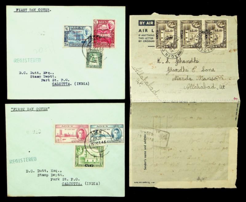 Aden Arabia 1946 Victory issue 2 Regd FDC w/ 6v+ Air Letter w/ 2a strip of 3 all sent to India (Image)
