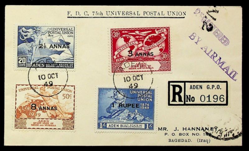 Aden Arabia 1949 75th Anniversary UPU 4v w/ ovpt on Regd airmail FDC w/ "AV2" cachet in black to Baghdad Iraq (Image)