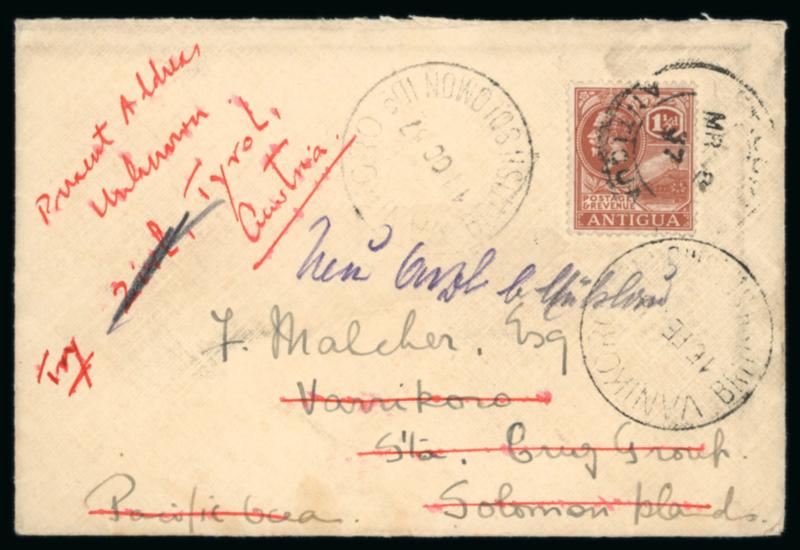 Antigua 1937 (MR 8) cover to Vanikoro, Solomon Islands bearing single franking 1 1/2d tied unclear cds, to left arrival cds of 14 OC, the envelope apparently not called for and redirected to Zirl, Tyrol, Austria with despatch date stamps front and back of 16 FE 38, there is no final arrival but there is a manuscript note stating arrival as 31 Mai 1938; fine and most unusual. (Image)