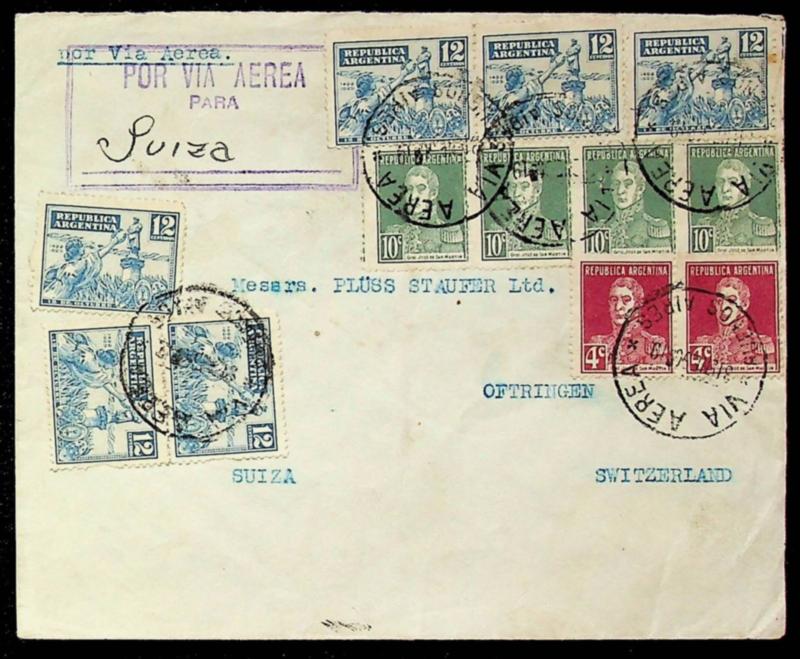 Argentina 1930 12v on airmail cover from Buenos Aires via Marseille France to Oftringen Switzerland (Image)