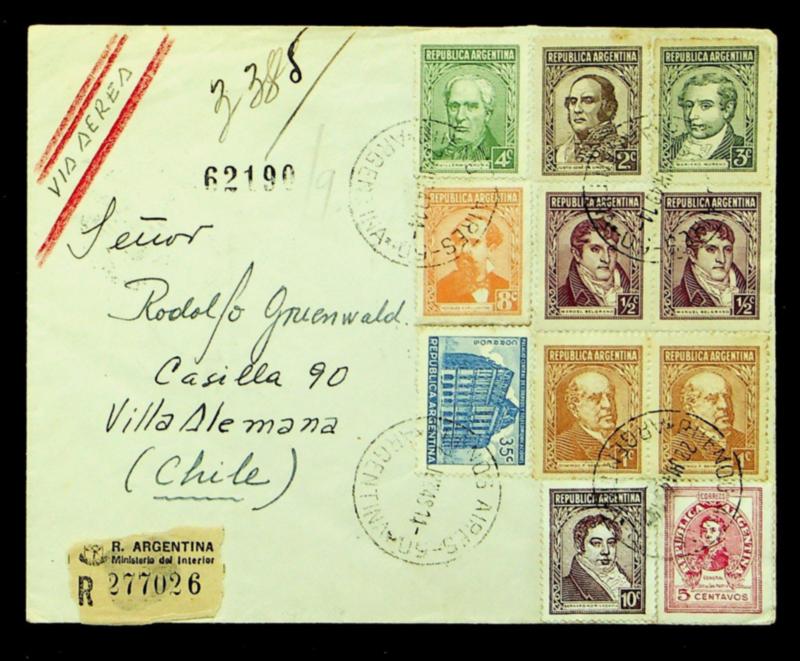 Argentina 1949 Famous Personalities 11v on Regd airmail cover from Buenos Aires to Villa Alemana Chile (Image)