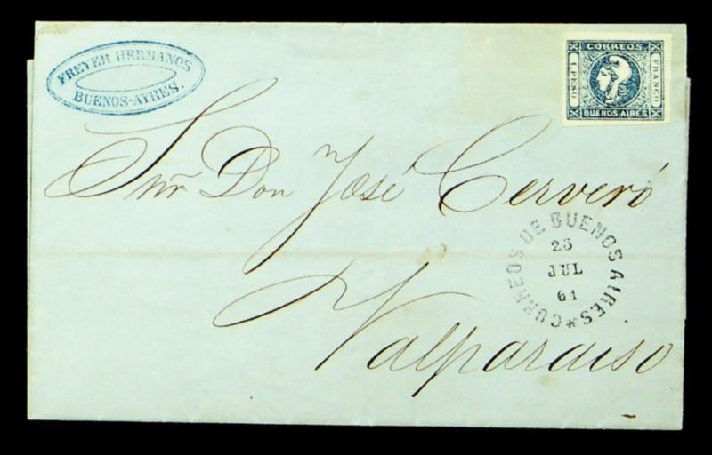 Argentina 1861 Liberty Head 1p blue on cover from Buenos Aires to Valparaiso Chile (Image)