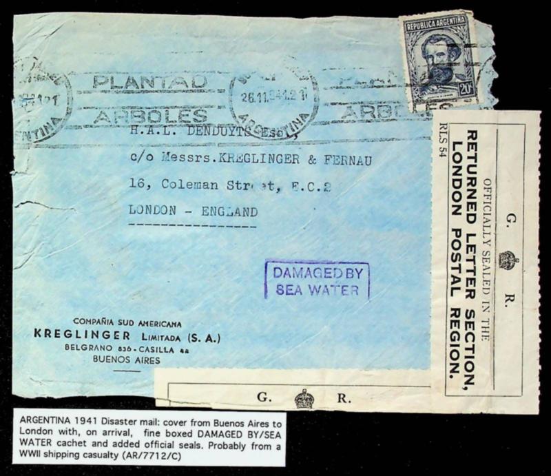 Argentina 1941 20c on Disaster mail Officially Sealed cover from Buenos Aires to England w/ boxed "DAMAGED BY SEA WATER" cachet (Image)