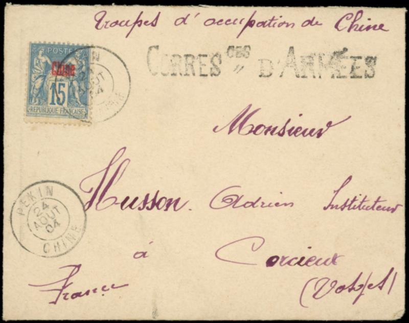 6 : 15c. bleu obl. PEKIN 24/8/64 s. Env., griffe "CORRESces" D'ARMEES", mention "Troupes d'occupation de Chine", TB (Image)