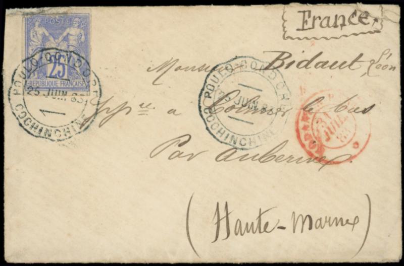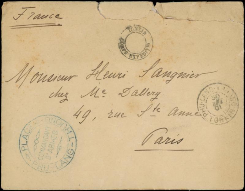 Càd PHU-LANG-THUONG 30/(5)/01 s. Env. (déchirure en haut), cachet TONKIN/CORPS EXPEDITre et cachet bleu PLACE /PHU-LANG-THUONG/COMMANDANT D'ARMES, arr. PARIS le 8/7, TB (Image)