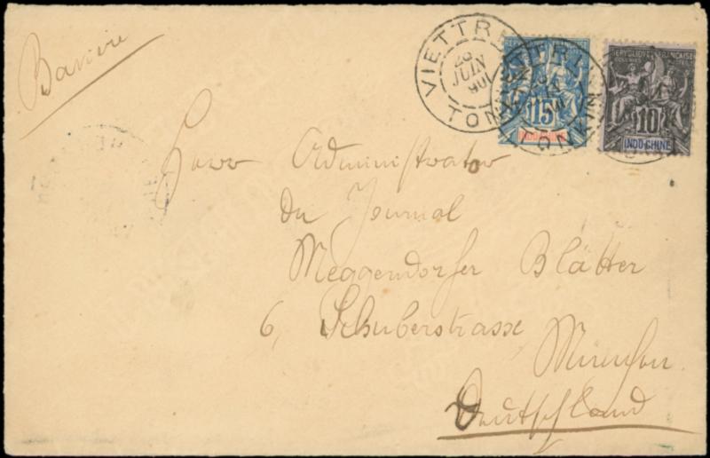 7 et 8 : 10c. et 15c. obl. càd VIETTRI TONKIN 26/6/01 s. Env., arr. MUENCHEN, TB (Image)