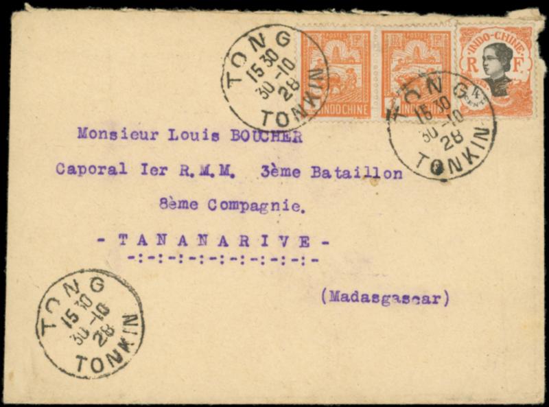 103 : 4c. orange et N°127 1c. orange, PAIRE obl. TONG 30/10/28 s. Env. pour MADAGASCAR, TB (Image)