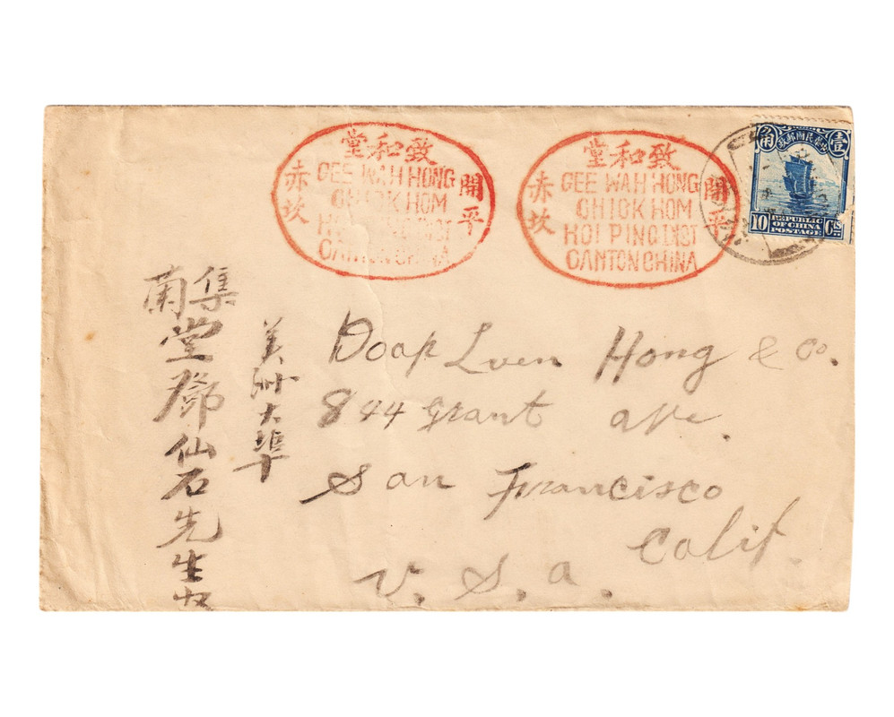 China Cover to USA 1915 Country: China Series: London Print Junk, Reaper, and Hall of Classics Issue Catalog Number: Michel CN-IM 158I Stamp Number CN-IM 211 Yvert et Tellier CN-IM 155 Stanley Gibbons CN-IM 77 China Stamp Society CN-IM 249 Theme: Railways | Sailing Vessels | Ships Issued: 1913-05-05 Size: 22 x 24 mm Colors: dark blue Printers: Waterlow & Sons Ltd Format: Stamp Issue: Daily Stamp Perforation: line14 Printing: Gravure print Denomination: 10 Chinese cents (Image)