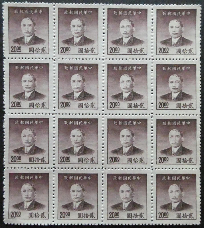 Country: China Series: Dr. Sun Yat-sen, new version Catalog number: Michel CN-IM 952 Stamp Number CN-IM 888 Yvert et Tellier CN-IM 717 Stanley Gibbons CN-IM 1154 China Stamp Society CN-IM 1351 Theme: Famous people | Freedom fighters | Physicists | Men | Politicians | Revolutionaries | Statesmen | Heads of state Issued: 1949-01-06 Size: 23 x 27 mm Colors: Violet brown Printers: Dah Tung Book Co. Format: Stamp Issue: Daily stamp Perforation: line14 Printing: Gravure print Denomination: 20 Chinese dollars (Image)