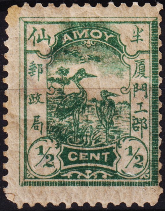 On June 8, 1895, China issued a stamp in the treaty port of Amoy, cataloged as Michel CN-AMO 1 and Stanley Gibbons CN-AMO 1. Printed in green using lithography by Carl Schleicher & Schüll, the stamp features a heron and belongs to the themes of animals and birds. It was released as a daily issue with a perforation of 11½ and carries a denomination of ½ Chinese cent. (Image)