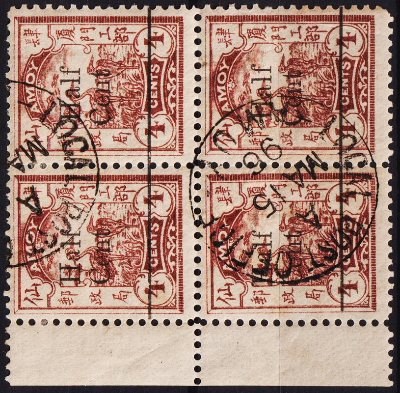 Amoy. China 1896 block AMOY Herons (surcharge "Half/Cent" thin "f") black print, clear cancel AMOY 96 Scott AM 9 VF
