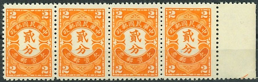China. China block 1932 Peking print Orange color 2 cent Postage-Due Stamp Tax 8 Scott J61 MNH
