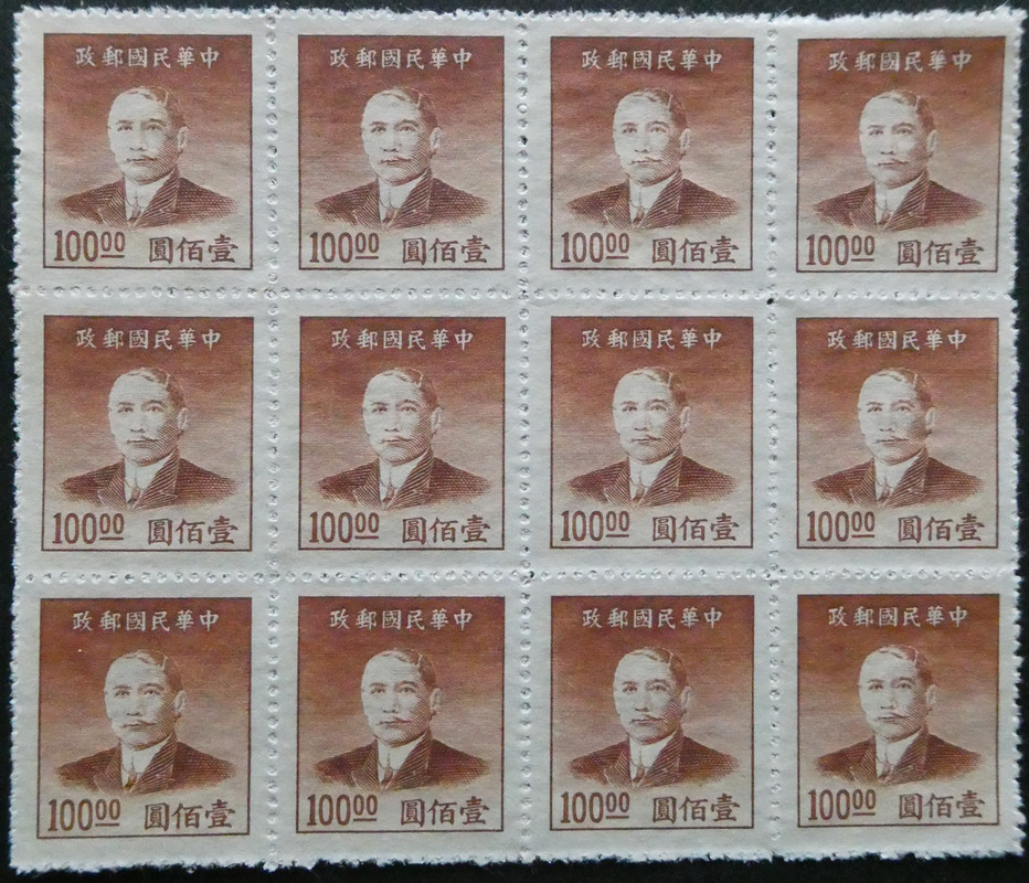 Country: China Series: Dr. Sun Yat-sen, new version Catalog number: Michel C N-IM 954 Stamp Number CN-IM 890 Yvert et Tellier CN-IM 719 Stanley Gibbons CN-IM 1156 China Stamp Society CN-IM 1353 Theme: Famous people | Freedom fighters | Physicists | Men | Politicians | Revolutionaries | Statesmen | Heads of state Issued:1949-01-06 Size: 23 x 27 mm Colors: brown Printers: Dah Tung Book Co. Format: Stamp Issue: Daily stamp Perforation: line14 Printing: Gravure print Gumming: Ungummed issue Denomination: 100 Chinese dollars (Image)