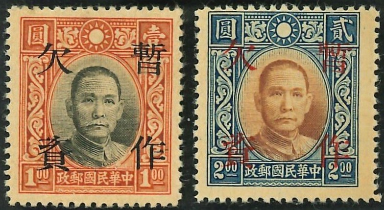 China. China Dr. Sun Yat-Sen 1940 Dah Tung Print Convert into Postage-Due Stamp Scott J67-68 MNH In 1940, in response to changes in postage rates and taxation of parcels, the highest denomination stamps of the Dr. Sun Yat-sen Definitive Series, originally printed by Dah Tung Print in Hong Kong, were reused as postage stamps. The one and two dollar denominations were overprinted with the character No. 4 Sung "(暫䳇 - temporary or stamp)" on all four sides. This overprint was done by the printery of Dah Tung Book Co., Hong Kong. These stamps, listed as Scott J67-68, became important in handling higher value postage. Both are presented here, making the series complete. (Image)