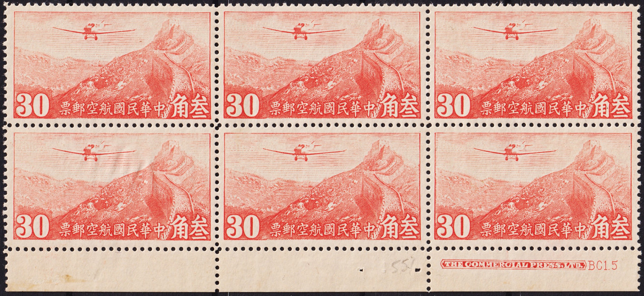 Country: China Series: Air Mail Hong Kong Commercial Press Print (1940/41)Catalog number: Michel CN-IM 371 Stamp Number CN-IM C34 Yvert et Tellier CN PA24(B) Stanley Gibbons CN-IM 557 China Stamp Society CN-IM AM41Variants: Theme: Architecture | Mountain | Flight | Aircraft | Landscape | Walls | UNESCO World Heritage List Released: 1941-05-23Colors: Ed Watermark: Without watermark Printing houses: Commercial Press Ltd. , Hong Kong Format: Stamp Edition: Air mail Teething: Varying Pressure: Gravure printing Denomination: 30 Chinese cents (Image)