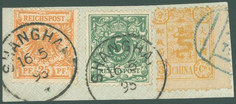 3 Ca. Orange yellow, fresh colours and in perfect condition with seal stamp in double postage with German post offices in China follower 5 Pfg. And 25 Pfg. Crown/eagle with single circle postmark "SHANGHAI 16.5.95. ", a very decorative and scarce combination! Expertized Bothe BPP.