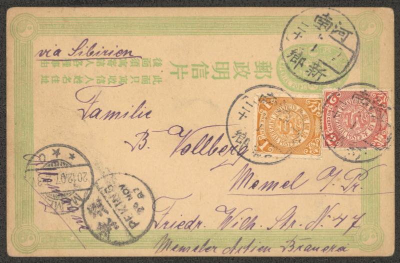 1 C. ocker und 2 C. rot als Zusatzfrankatur auf Ganzsache 1 C. grün, geschrieben in "SIN SIANG SIEN 24.11.07" nach Memel/Deutschland mit Transit- und Ankunftsstempeln. Selten! (Image)
