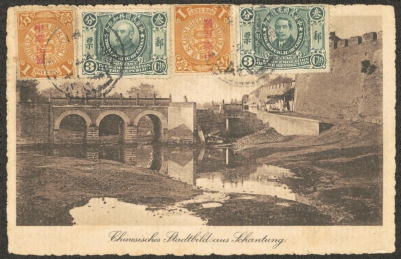 1 C. Ochre (2) with 3 C. Yatsen and 3 C. Shih quayside, as on the back franking on picture postcard "City picture SCHANTUNG", from "KIAUTSCHOU 14.4.13" to a sailors artillerymen in Tsingtau. Ex estate Erich Maye.