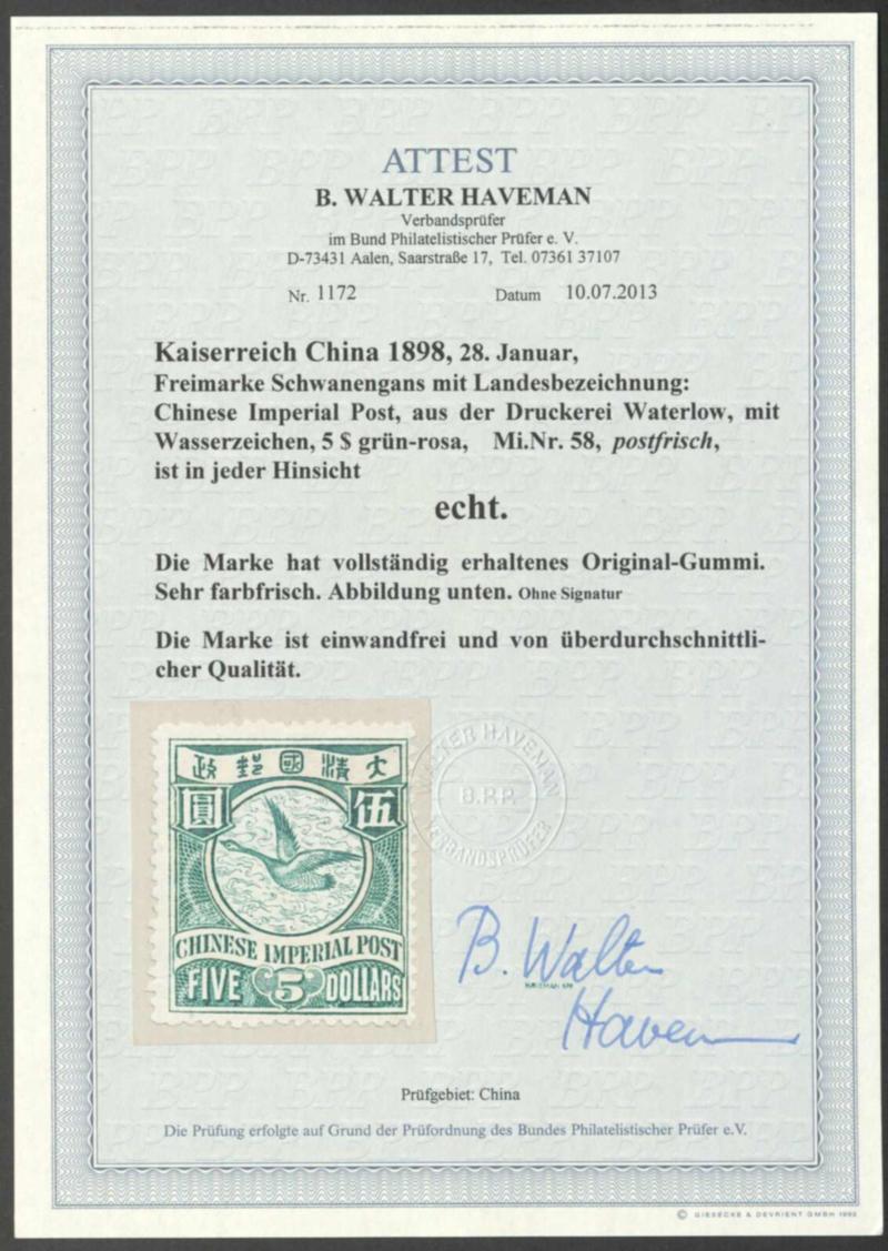 CHINA - 5 Dollar grün/rot, Schwanengans 1898, Inschrift "CHINESE IMPERIAL POST" mit Wasserzeichen, wundervoll farbfrisch, tadellos postfr. bzw. nahezu postfr. mit Originalgummierung. Außergewöhnlich schöne Qualität! Ein Wert mit Fotoattest "DIE MARKE IST EINWANDFREI UND VON ÜBERDURCHSCHNITTLICH GUTER QUALITÄT, POSTFRISCH" Haveman BPP. (Image)