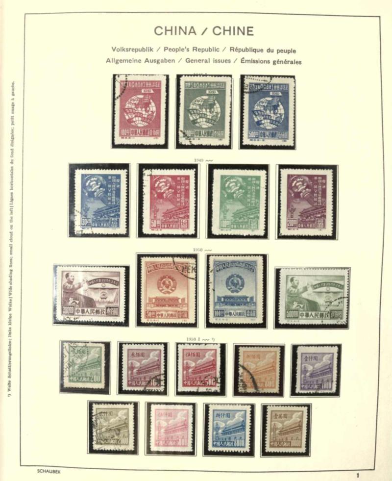 People´s Republic of China - 1949/81, very nice collection in the Schaubek illustrated album, nearly complete with a lot of better issues right up to top values, mainly in good condition, also the scarce set Mei Lan capture 1962 cut mint never hinged in exceptional good condition (50 Y. Gum slightly pass), kids games 1963 cut unused, a strong part Cultural Revolution, as well some better sets, also the two of them strip of five from 1967 used (first strip slightly prefolded, second strip a little oxidated), the scarce strip of five "five new directives MAOS" from 1968 mint never hinged (between the 3. And 4. Stamp slightly prefolded), many further better sets, also the monk stamp 1980 mint never hinged and so on also the souvenir sheet issues are complete is existing, with also Table tennis souvenir sheet 1961 unused, actor souvenir sheet 1962 with appropriate first day special cancel, Peonies souvenir sheet 1964 unused, 15 years People's Republic China-block 1964 used and the issues from the seventies, with also the girl souvenir sheet 1979 mint never hinged and so on an impressing collection this sought-after area with outstanding substance!