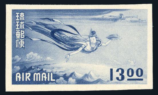 U.S. Possessions; Ryukyus, Airmail, 1951, 2nd Issue, 13y Blue, Imperf Proof, #C4P5, ungummed, pos. 13, nice margins all round, Very Fine. Scott $850. Estimate $180-220. (Image)