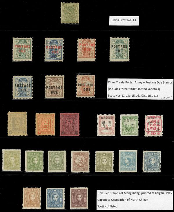 China, Treaty Ports and Local Posts Mint Group, o.g., 24 items on a Vario page, incl. Amoy Postage Dues #J1, J3a, J5, J6, J9a, J10, J11a, KewKiang Locals, 1945 Meng Kiang unissued set of 10, plus China #13, generally Fine to Very Fine. Scott $1,800+. Estimate $400-600. (Image)