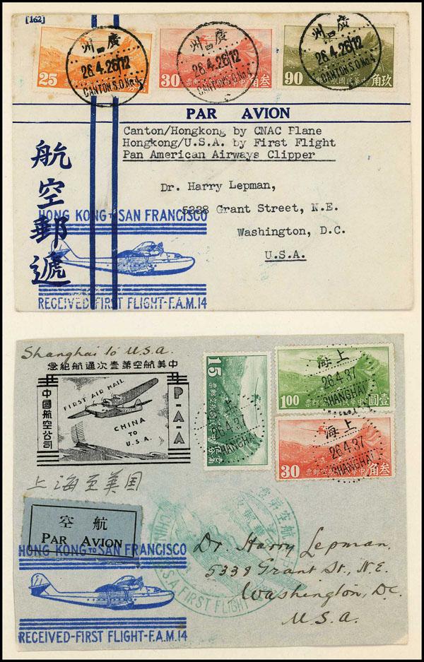 China, Group of 13 Early 20th Century Covers, incl. FAM#14 flights to U.S., 5 1920's Manchuria overprint covers, 1929 sets of 4 on individual covers, etc., mixed condition. Estimate $300-400. (Image)