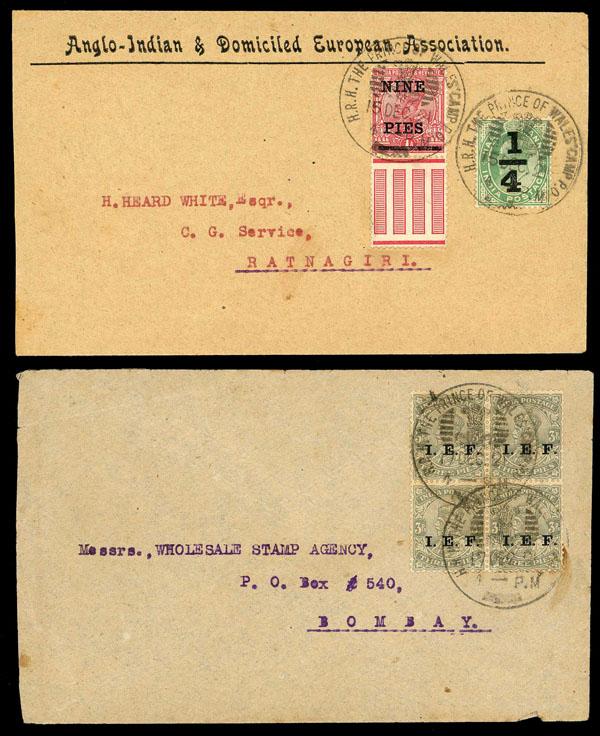 India, British P.O. in Nepal; 1921 Two H.R.H. Hunting Camp Covers in Terai, Nepal, 1st Dec 1921 India 9p and ¼p surcharges tied to imprint cover to Ratnagiri, India by "HRH The Price Of Wales' Camp P.O." fancy postmark, arrival backstamp; 2nd 17 Dec 1921 to Bombay, arrival backstamp, Fine. This marking used at hunting camp on Terai district of Nepal, Ex Singer, illustrated on page 35. Estimate $200-250. (Image)