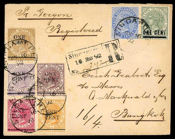 Malaya; Straits Settlements, 1892 Singapore Registered Cover to Thailand, Scott #45, 77, 78, 79, 80, 81 and 82 Singapore registered to Bangkok, philatelic. Ex Ernst Sielaff Estate. Estimate $150-200. (Image)