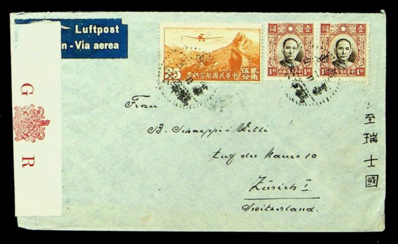 China 1940 WWII Sun Yat-Sen pair+ 25y on Hong Kong censored airmail cover to Zurich Switzerland (Image)
