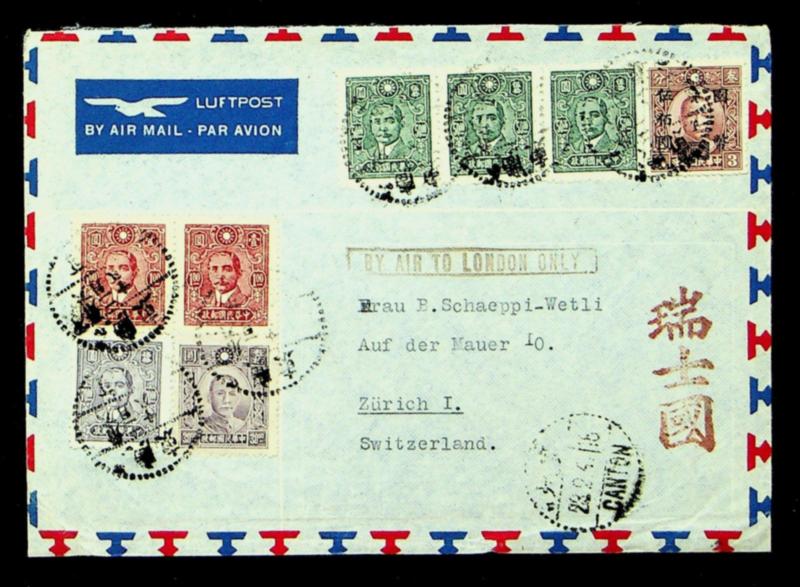 China 1947 Sun Yat-Sen 1 w/ s/c+ 7v on airmail cover via Canton/ Hong Kong by air to London UK only, then to Zurich Switzerland (Image)