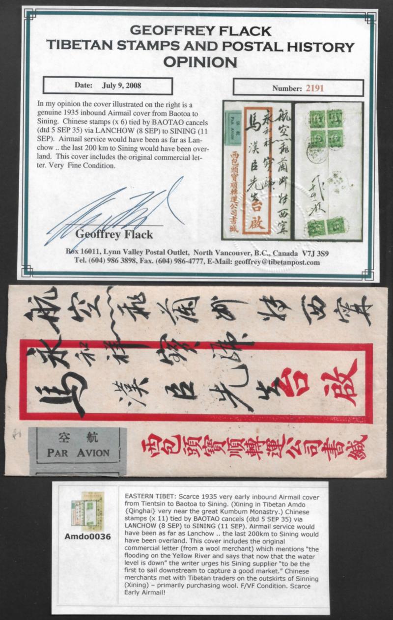 China Tibet 1935 Very Rare Exhibition item - Inbound airmail cover from Baotoa to Sining w/ 6 Chinese stamps, via Lanchow - Original 5 page Letter from Wool merchant regarding flooding of the Yellow river (Image)