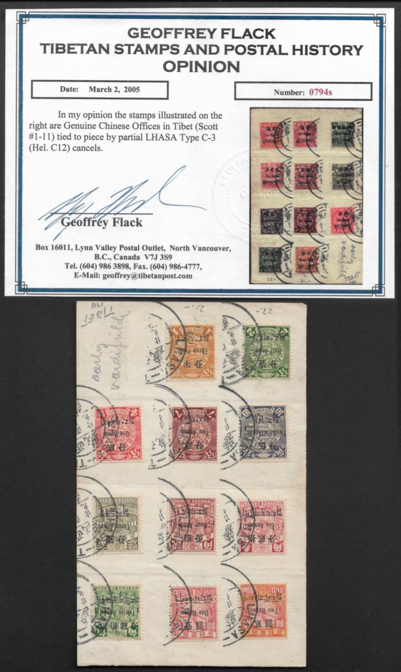 China Post Offices in Tibet (Scott 1-11) tied to a piece and all cancelled with Lhasa The C-3 postmark, Hellrigl T#C12, extremely rare with certificate - Exceptional Exhibition item (Image)