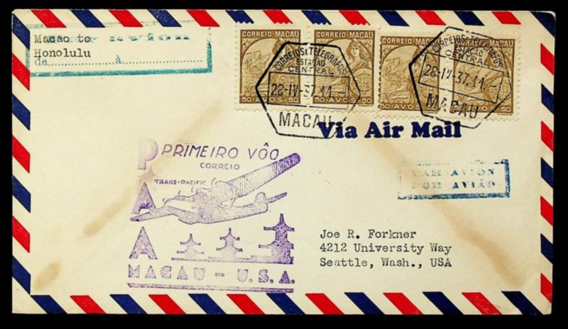 Macau China 1937 50ax4 on PAA First Transpacific Flight Airmail cover via Honolulu Hawaii to Seattle Washington USA (Image)