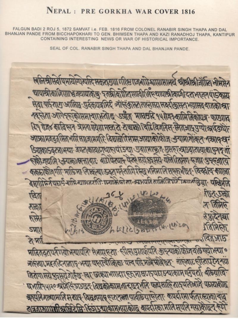 Anglo Nepal War 1816 cover from Colonel Ranabir Singh Thapa & Dal Bhanjan Pande from Bicchapokhari to General Bhimsen Thapa & Kazi Ranadhoj Thapa, Kantipur containing interesting news of war - Great historical importance - Exceptionally Rare! (Image)