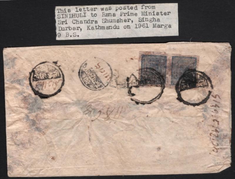 Nepal 1a Classic Issue pair on cover from SINDHULI to the Prime Minister Sri Chandra Shumsher Rana, Singha Durbar, Kathmandu - RARE (Image)