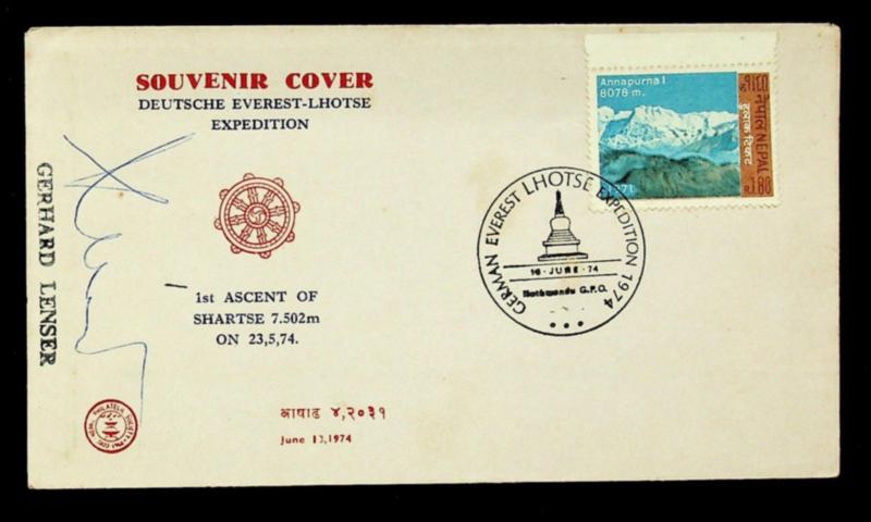 Nepal 1974 German Mt. Everest-Lhotse Expedition signed souvenir cover w/ 1.80R (Image)