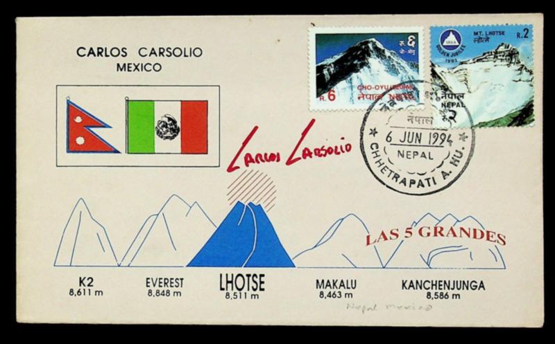 Nepal 1996 Carlos Carsolio Mexico Mt. Everest & Kanchenjunga Successful Expedition signed cover w/ 2v (Image)