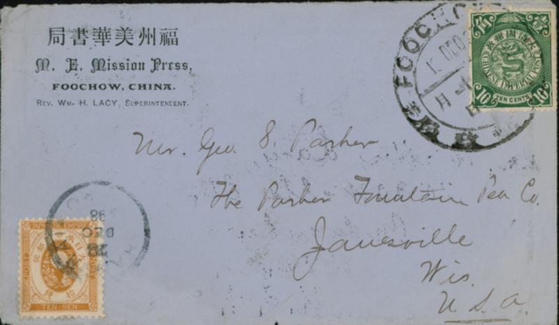 China 1898 10c cancelled by datestamp FOOCHOWFOW to USA transit :SHANGHAI(CHINA),SHANGHAI(JAPAN),YOKOHAMA,VANCOUVER arrival :JANESVILLE combination cover with Japan 10 Sen 1898-12-23 Shanghai (Image1)