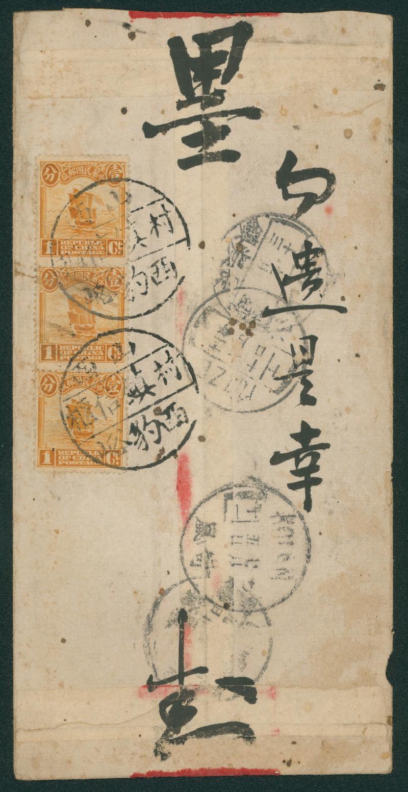 China 1922 London print Junk 1c.(3) cancelled by obliteration in black 山西 村鎮信櫃 西豹峪 to Yuci transit :Kelan (Image1)