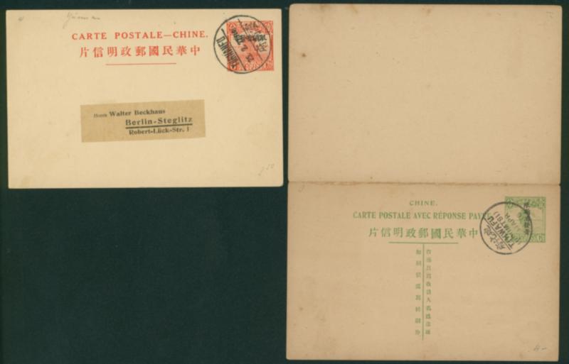 China 2 examples of stationery usage. Yunnan Province Junk 6c. postcard from Yunnanfu on 1927-02-25. and Sinkiang Province Junk 1c. reply card from Urumutsi on 1916-04-11. (Image1)