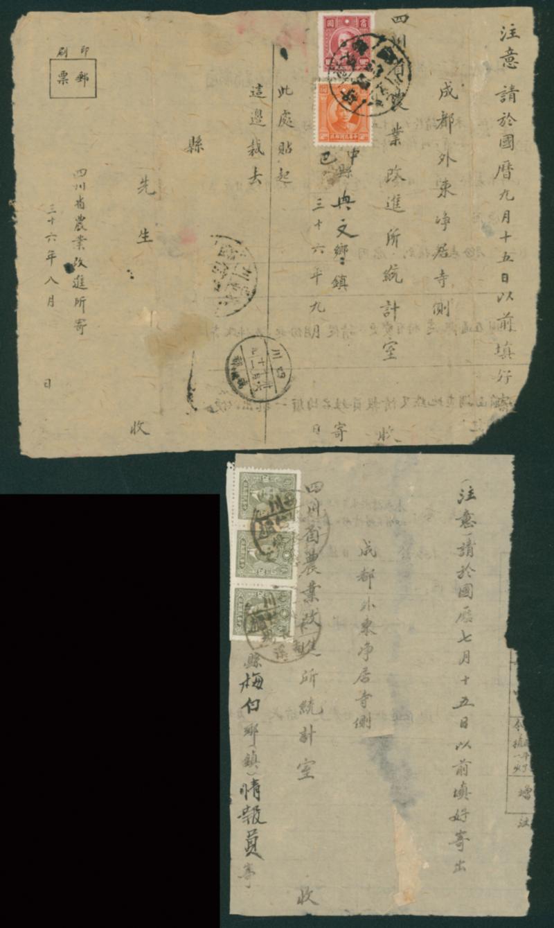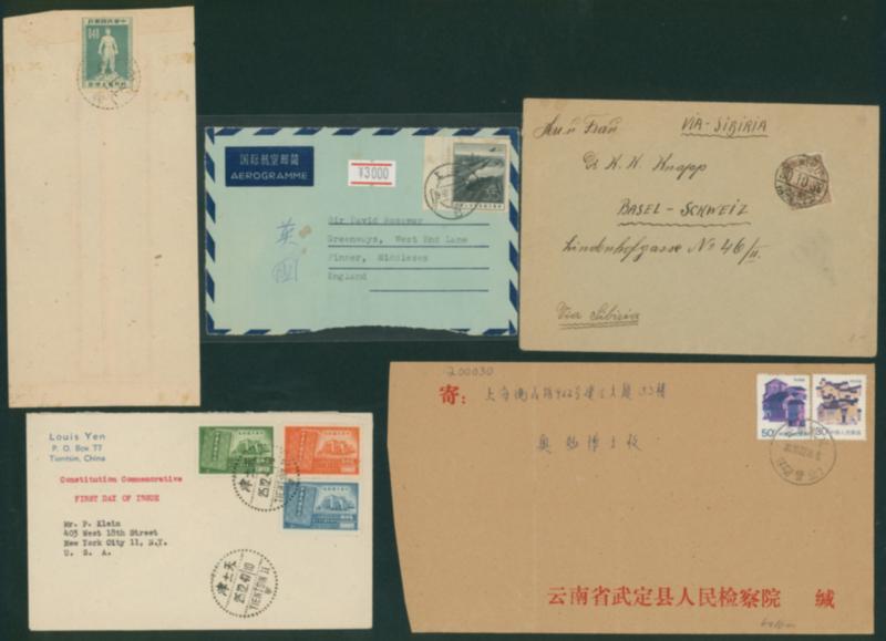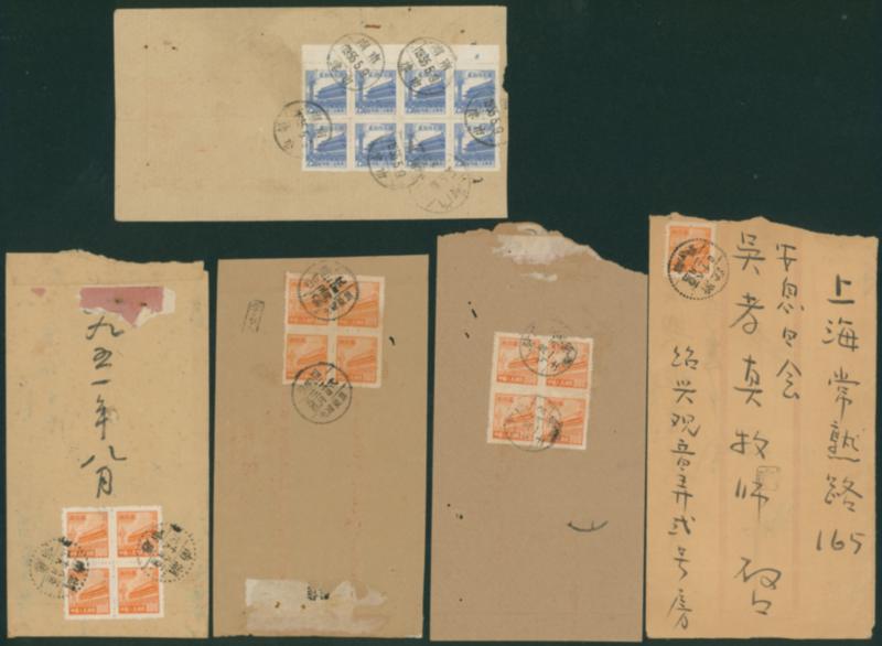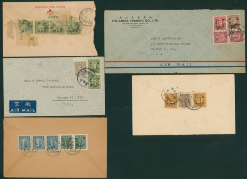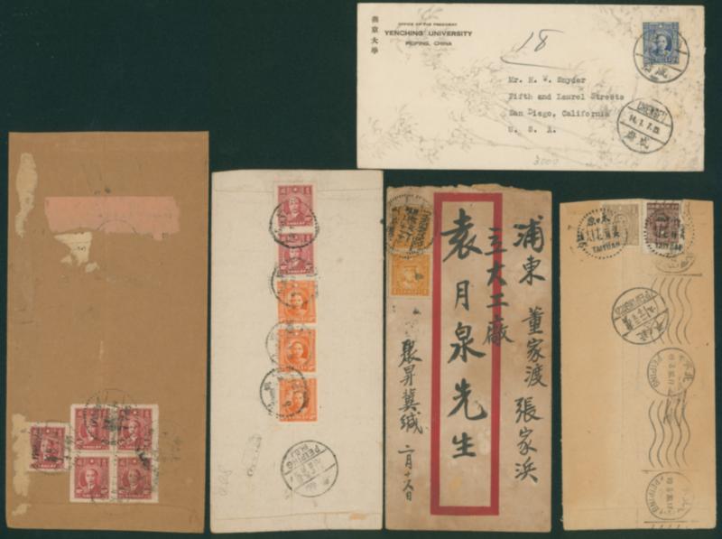 China , 5 covers 1935-1947 There are four examples of domestic usage, and one is in the United States. Includes interesting use cases such as special handling. There are examples of use where part of the envelope has been cut off. (Image1)