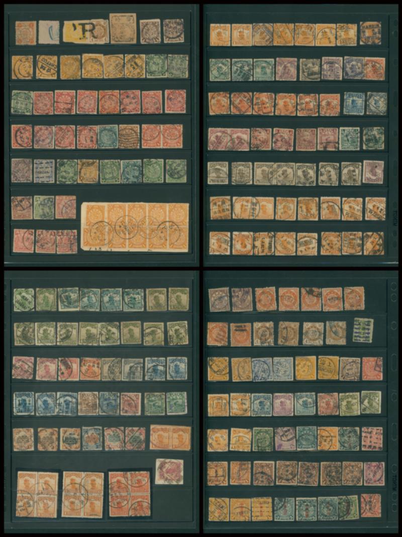 China 1885-1923 A used lot consisting mainly of Coiling Dragon and junk stamps organized into stock leaves. , 217 stamps Includes pairs, on pieces and blocks. used Many of the postmarks are legible. (Image1)