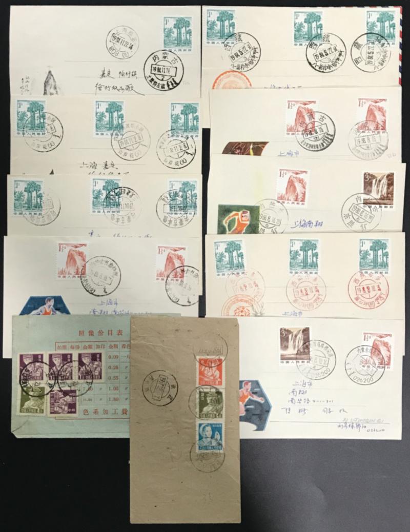China , 2 covers There are two examples of Post Box canceling on the cover.Some of the stamps on the front cover have been cut with scissors. The first one is an open cover addressed to Chengdu with Bazhung Post Box cancel. and The front cover was addressed to Chengdu with the Nanxi Post Box cancellation. (Image1)